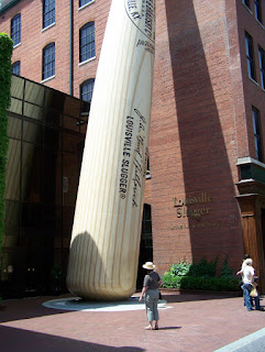 Today was the nicest day we've had since leaving Montana. No wind, blue sky's and in the 80's. After breakfast we took a scenic route back to Louisville, thanks to "Dottie" (our GPS). Our first stop was the Louisville Slugger factory and museum. What a nice tour, both of us really enjoyed it. After the tour and the short movie about the thrill of baseball and "the crack of the bat" we went to the souvenir store. You can buy a custom bat with engraving plus much more. We purchased personalized bats for the grandsons and some other items. While we were at the factory I hit some fast balls from the pitching machine, I went 7 out of 10 with one fouling off my foot.....ouch! The we spent a few hours walking along the Ohio river and watching all that was happening, the Louisville Open, AVP Beach Volleyball tour is the big weekend event. About 3 blocks down the river they had rock and roll bands playing with vendors booths and/or tents selling just about everything.